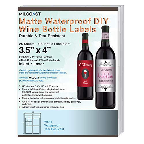 Milcoast Glossy Waterproof DIY Water Bottle Labels 8.5” x 2” for Inkjet / Laser Printers - 25 Sheets